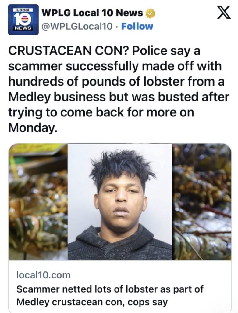 Autoridades del sur de Florida arrestaron a un hombre residente en el área de Hialeah, acusado de ejecutar una estafa de gran escala vinculada a la sustracción de langosta de un negocio en Medley. El caso llamó la atención no solo por el volumen del producto robado, sino por la forma en que se llevó a cabo.